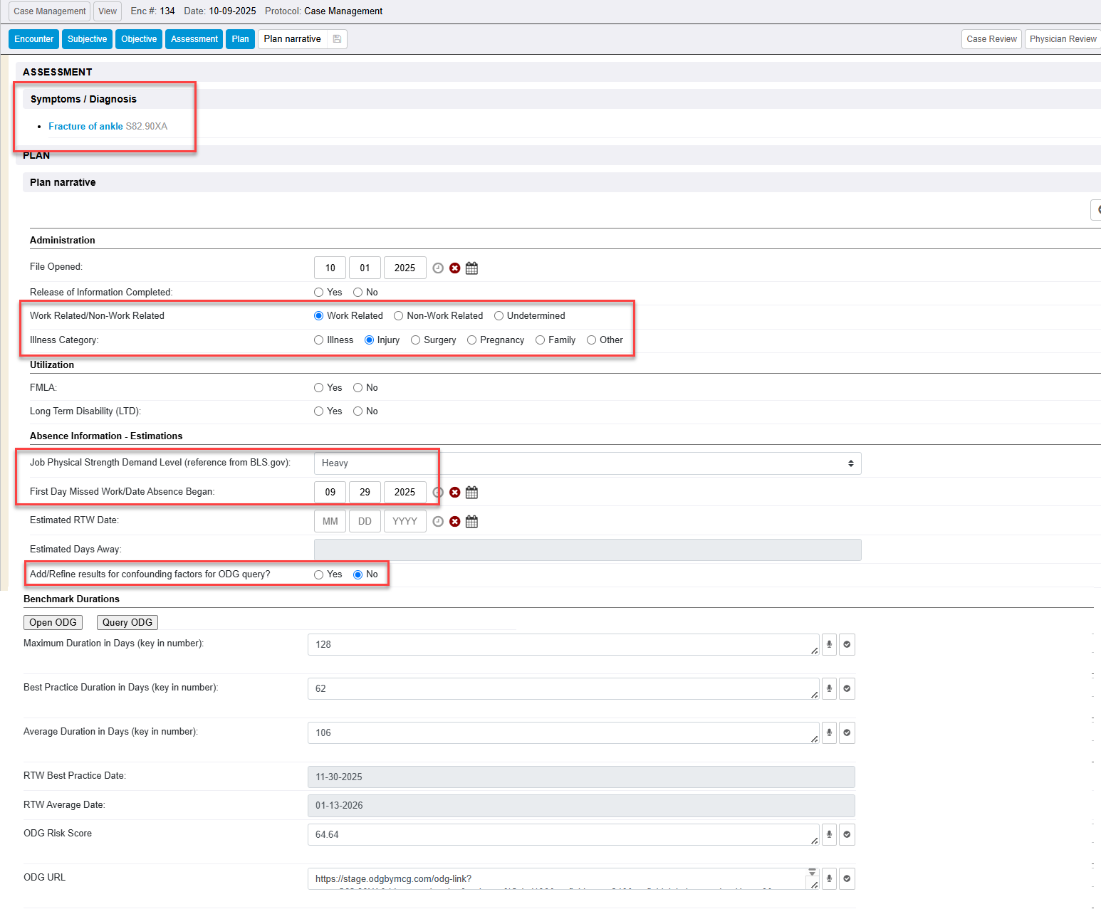 Takes WebChart encounter intake information (all diagnosis codes documented in the encounter, specific key demographics of the chart, specific Plan Narrative encounter data elements using the Case Management chief complaint protocol of WebChart , and confounding factors to forecast projected disability return to work dates and risk factor score. ODG uses predictive analytics on the ODG claims database of over ten million claims.